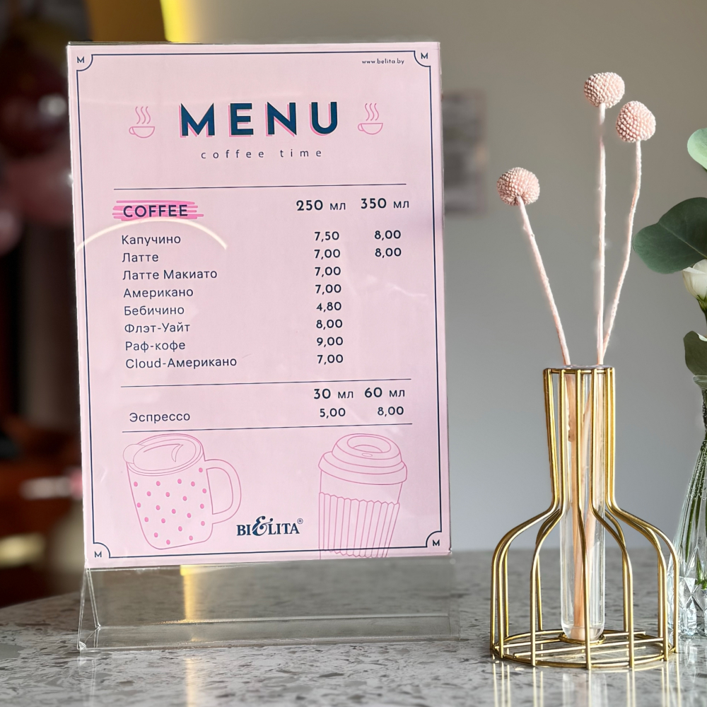 В кофейне «Белита» гостям доступен широкий выбор как традиционных, так и авторских кофейных напитков. Примечательно, что замена привычного молока на альтернативное (например, овсяное или миндальное) производится без дополнительной платы. Для любителей сладкого в ассортименте представлены кондитерские изделия, приготовленные исключительно из натуральных компонентов и без использования сахара.